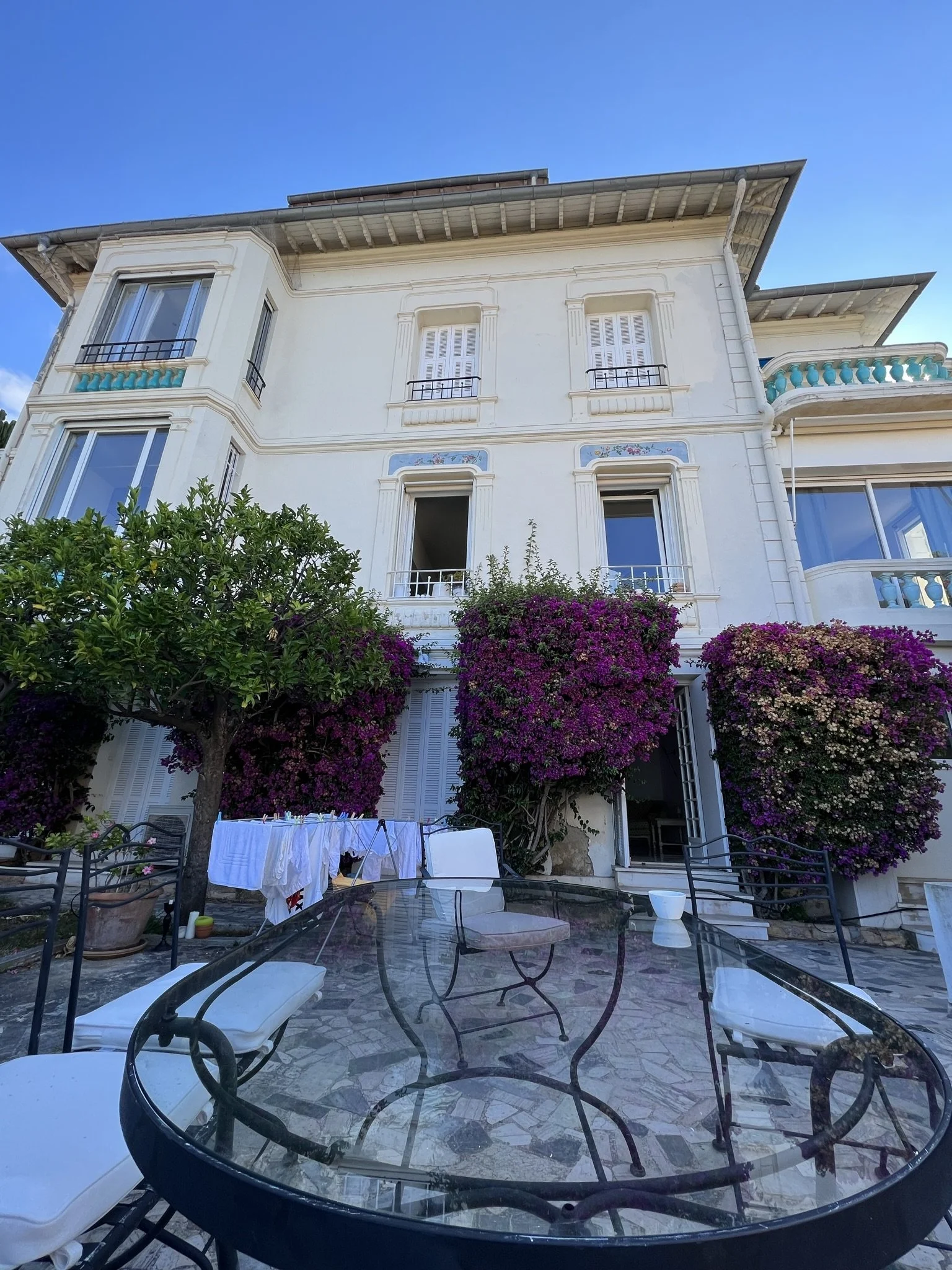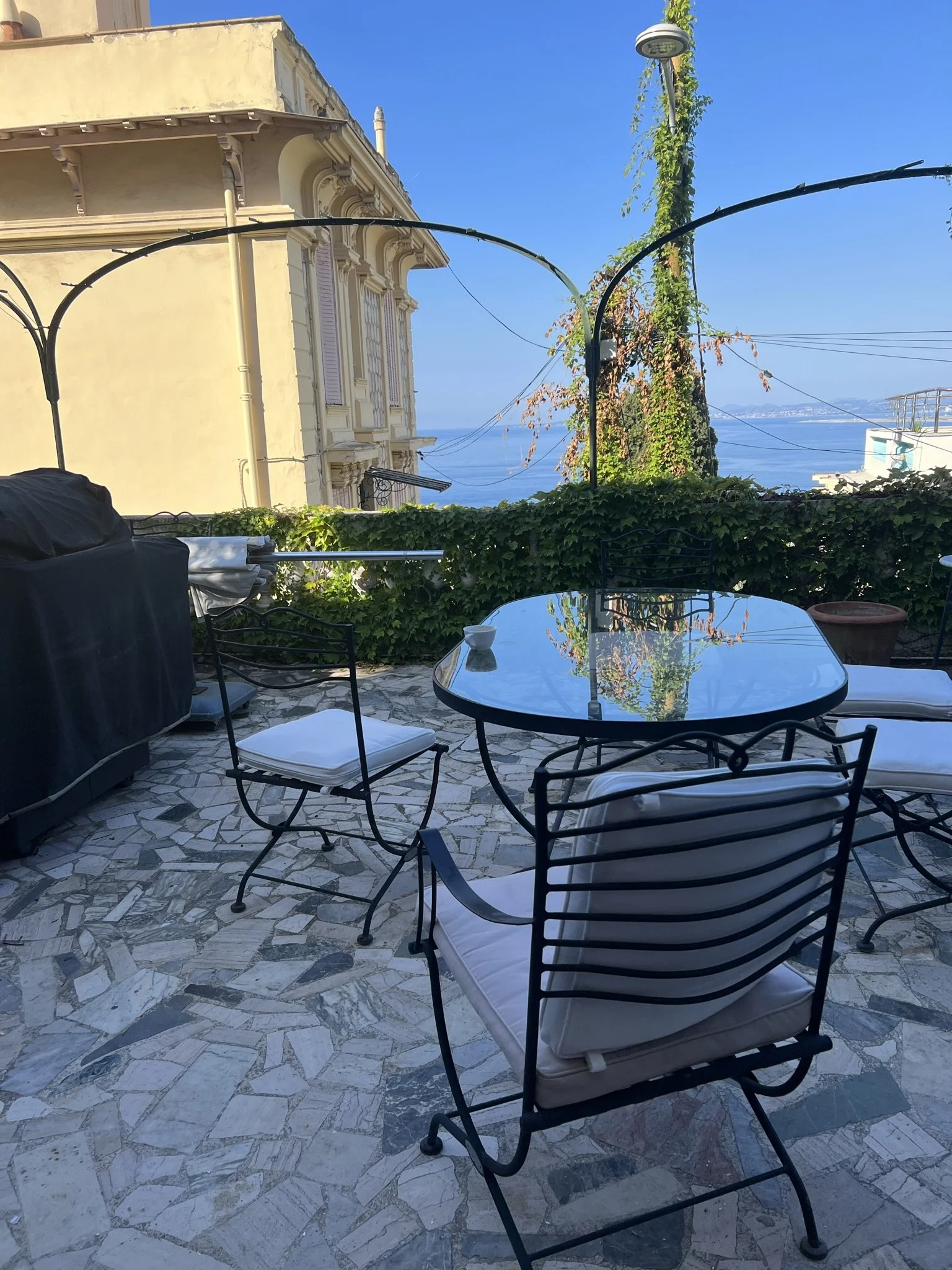 Villa Rosalba 1 ligger i første etasje av en klassisk, fransk bygning omgitt av vakre bougainvillea som klatrer langs fasaden.