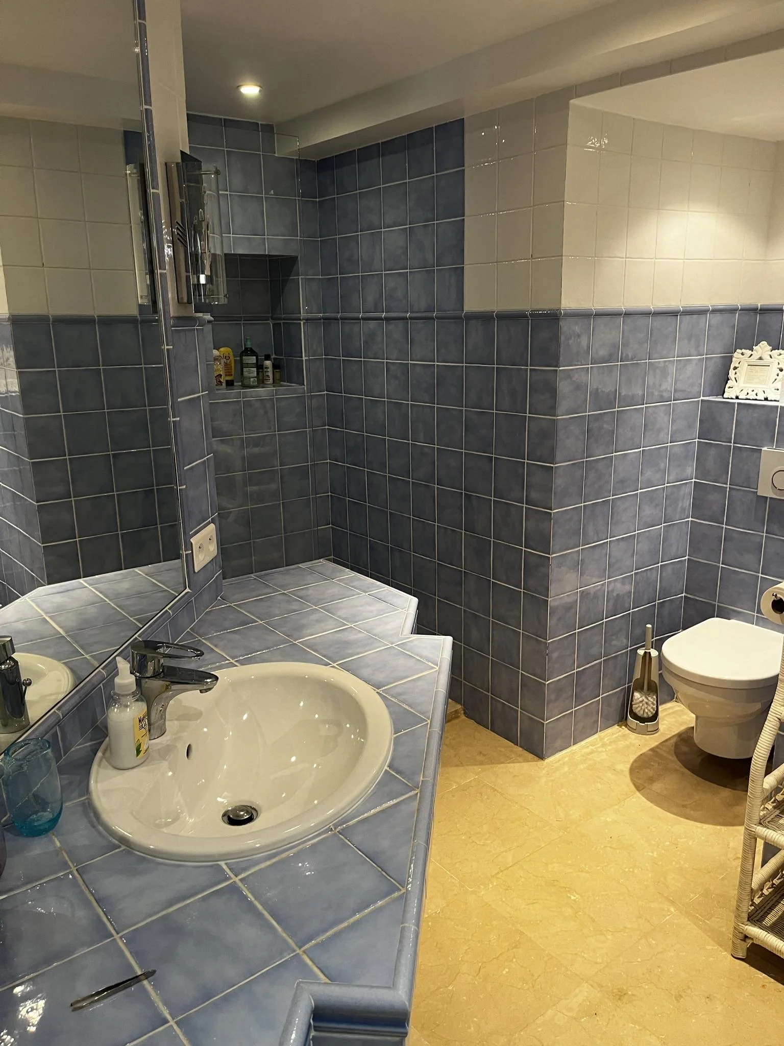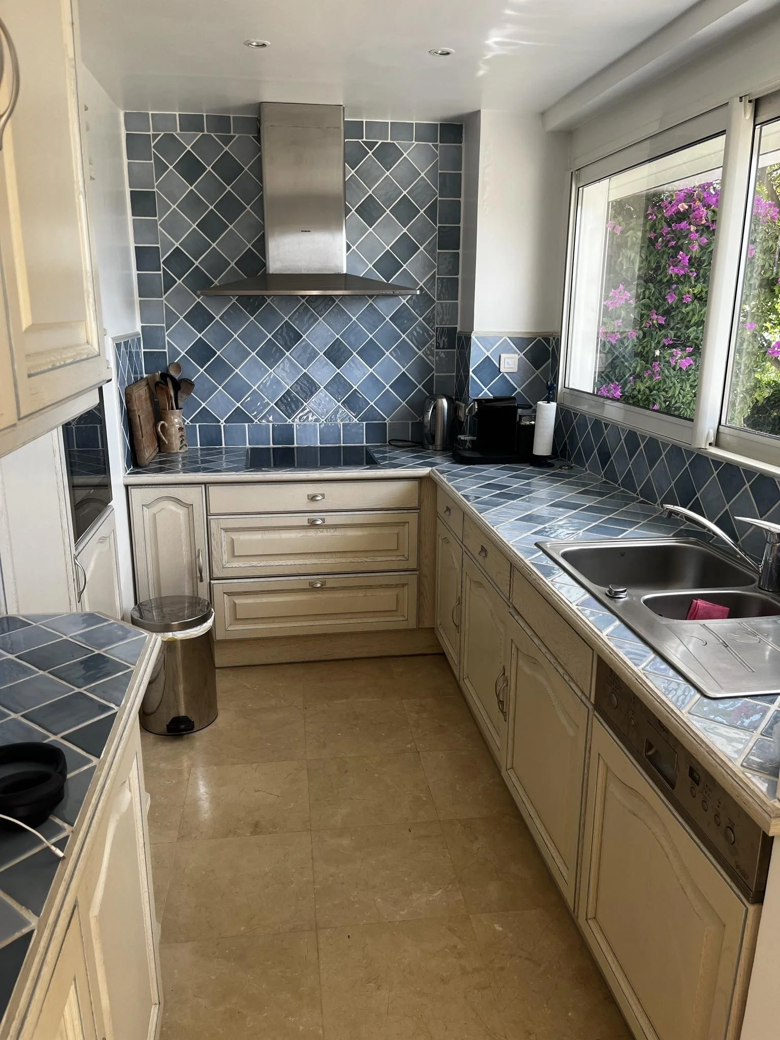 Kjøkkenet er lyst og innbydende, med klassiske fliser i blåtoner som gir en frisk, middelhavsinspirert atmosfære. Store vinduer slipper inn rikelig med dagslys og gir en vakker utsikt over uteplassen, bougainvilleaen og det glitrende havet.